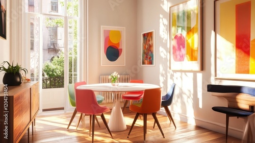colourful, dining, room, round, table, chair, various, bright, potted, several, cheerful, plant, atmosphere, design, interior, apartment, wooden, home, living, white, furniture, wall, modern, flat, house, window, space, decor, yellow, floor, wood, pink, loft, cosy, rug, cupboard, elegant, pastel, open, lamp, poster, grey, sofa, couch, armchair, black, settee, stylish, luxury