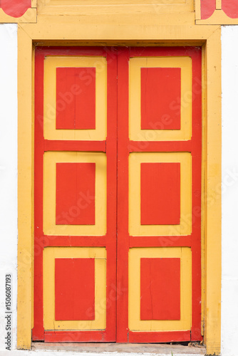 A colorful exterior facade. Vibrant Wooden Colonial Door in Traditional Style. Colombian fecade