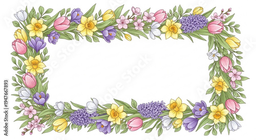 A colorful floral border frame with a mix of tulips, daffodils, and other flowers in pastel shades, perfect for decorating and adding a touch of spring to any design