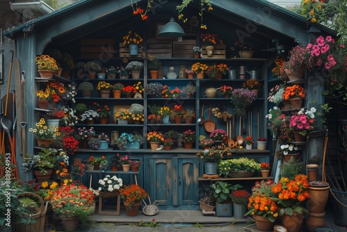 garden, shed, teal, flower, pot, shelf, blooming, vibrant, colourful, display, hanging, basket, tool, gardening, arrangement, quaint, rustic, nature, outdoors, summer, autumn, floral, greenery, plant, beautiful, charme, shop, flower, market, potted, plant, decor, backyard, outside, home, landscaping, design, landscape, exterior, house, bungalow, spring, racked, greenhouse, center, bouquet, art, furniture, bench, gate