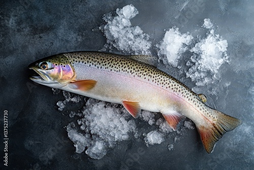 fish, seafood, food, cookery, fresh, ice, crushed, cold, scale, gill, fin, tail, eye, skin, flesh, pattern, dot, speckled, iridescent, colours, rainbow, pink, orange, grey, black, detail, texture, surface, background, aquatic, underwater, wild, nature, animal, dead, preparation, cooking, culinary, epicure, protein, raw, studio, close, overhead, diagonal, pristine, delicious, appetising