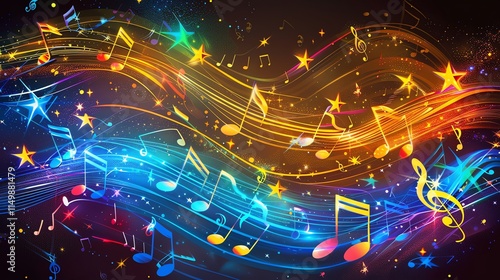 A colorful, glowing abstract background with musical notes, stars, and streaks of light.