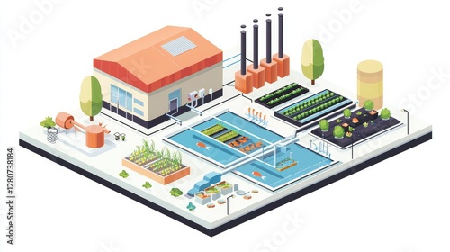 A colorful, isometric illustration of an agricultural facility featuring pools, greenhouses, and a storage building, emphasizing sustainable farming practices.
