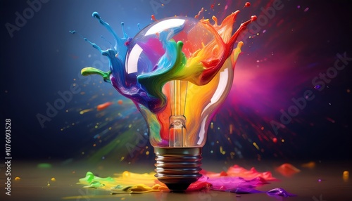 A colorful light bulb bursts with splashes of vibrant paint, symbolizing creativity and inspiration.