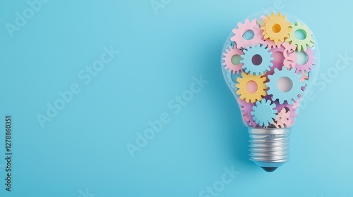 A colorful light bulb filled with pastel gears, set against a blue background, symbolizing creativity and innovation.