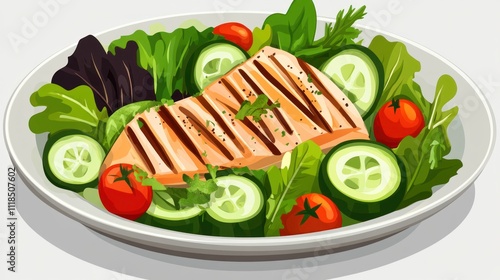 salad, salmon, vegetable, greener, tomatoes, cucumber, healthy, meal, nourishment, cookery, fresh, grilled, food, plate, herb, garnish, colours, diet, culinary, ingredient, favor, presentation, organic, protein, vitamin, mineral, appetising, delicious, dining, lunch, dinner, colourful, platter, freshness, cooking, receipe, epicure, seasonal, vibrant, wholesome, tasty, balanced, light, refreshing, enjoyment, satisfaction