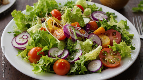 A colorful salad on a white plate features fresh lettuce, sliced cherry tomatoes, red onion rings, and shredded cheese.