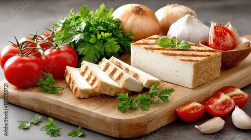 A colorful selection of fresh vegetables beautifully arranged on a wooden cutting board with copy space for text