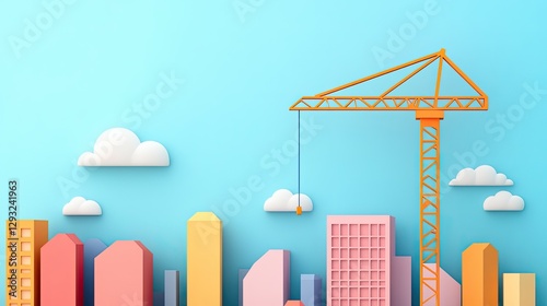 A colorful skyline with a construction crane against a bright blue sky.