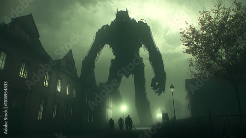 titan, mechanical, robot, giant, colossal, large, towering, looming, imposing, figure, silhouette, town, fog, green, sky, night, street, building, house, window, light, street light, people, walking, ominous, dark, eerie, mysterious, fantasy, futuristic, artwork, illustration, digital, art, concept, design