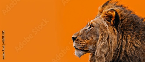 A commanding lion, majestic and full of dignity, gazes thoughtfully into the distance against a bold orange backdrop, embodying strength and nobility.