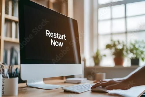 A computer displaying the words "Restart Now" is on a desk next to a keyboard and a hand. There are shelves and plants in the background.