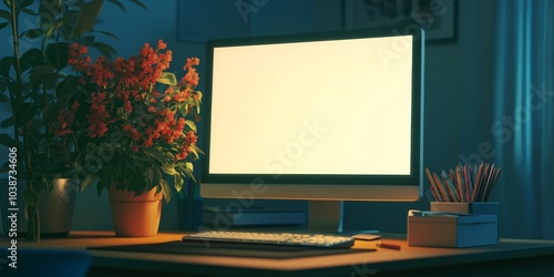 A computer monitor shows a blank screen. There's a flower pot and a pencil box on the desk next to it.