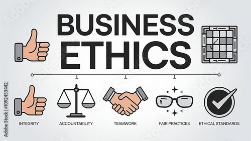 A concept illustration of business ethics and corporate responsibility. There is a large text that says "Business Ethics".