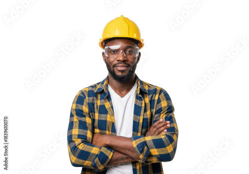 A confident black construction worker wearing a yellow hard hat and safety glasses with arms crossed isolated on transparent background