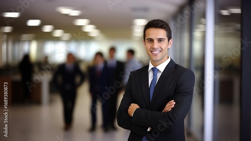 confident, businessman, standing, office, arm, crossed, smiling, warmly, portrait, environment, interior, atmosphere, men at work
