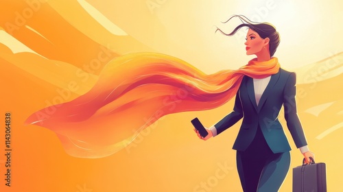 A confident businesswoman strides forward, holding a smartphone and briefcase, as her flowing scarf dances in the warm sunset light, symbolizing ambition. Generative AI