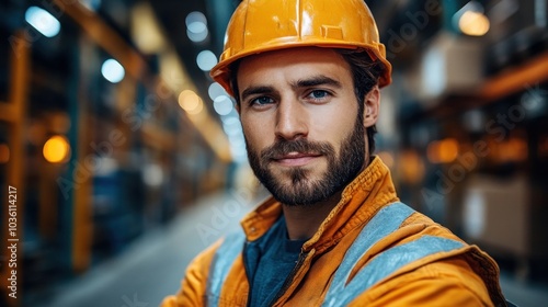 A confident construction worker wearing an orange safety jacket and hard hat stands in a well-lit warehouse, surrounded by shelves filled with supplies, ready for the day's tasks