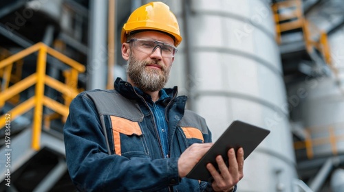 A confident engineer in safety gear uses a tablet to manage operations at a modern industrial facility.