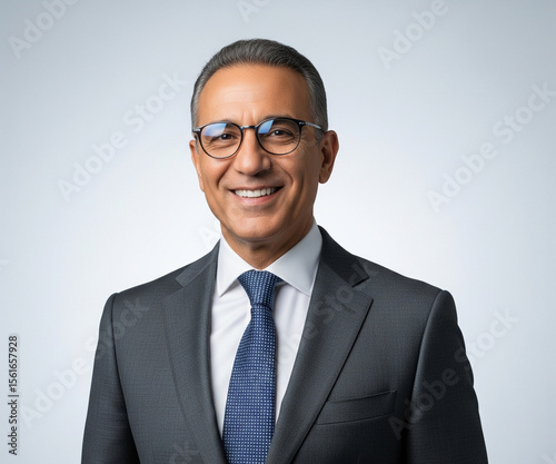 A confident, middle-aged Arab businessman in elegant business attire and glasses smiles charismatically against a clean, softly lit studio background.