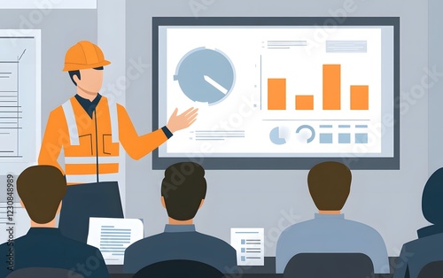 A construction manager presents project data to a team during a meeting