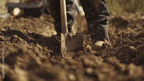 A construction worker digging a trench for utility lines. Featuring laborious effort and site preparation