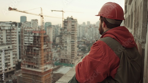 A construction worker in a red helmet and jacket gazes at a cityscape from a rooftop. Numerous cranes and buildings populate the hazy skyline.