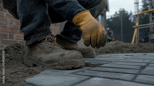 construction, men at work, glove, boot, cement, paving, stone, pathway, brick, work, hand, dirty, grey, close, detail, labor, craft, building, project, installing, ground, surface, cobbled, texture, protection, yellow, black, jean, leg, crouched, concrete, setting, sand, dirtied, footwear, safety, exterior, day, job, manual, heavy, duty, professional, industrial, builder, arrangement, structure
