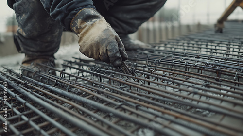 A construction worker securing metal rods for concrete. Featuring skill and craftsmanship