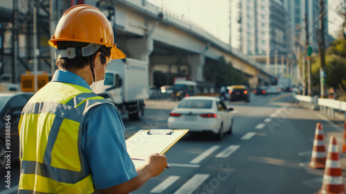 A construction worker wearing safety gear, holding a clipboard, supervising a busy city street under an overpass.