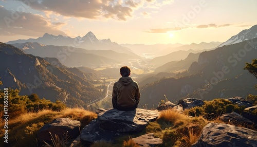 A contemplative figure sits atop a mountain peak, gazing at a vast valley bathed in the golden light of a serene sunrise.