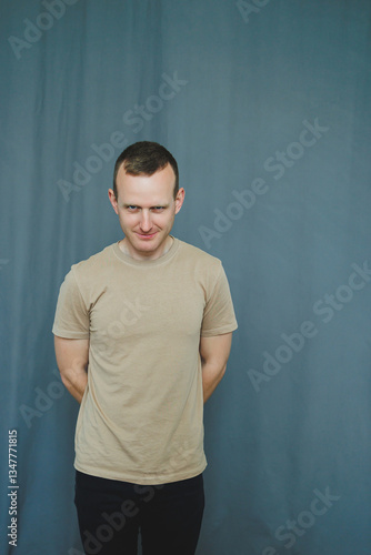A contemplative young man is posed thoughtfully in front of a softly blended gradient background that creates a serene atmosphere, allowing for deep reflection on individuality and existence