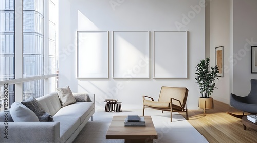 A contemporary gallery room with three identical white frames hanging symmetrically.
