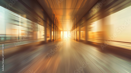 A contemporary office hallway captured with a sense of speed and motion, bathed in warm light.