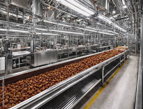 A conveyor belt is filled with food items