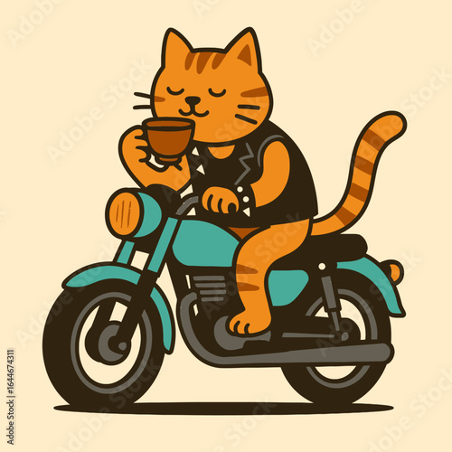 cat, felino, ginger, tabby, animal, pet, cartoon, illustration, drawing, character, mascot, riding, motorcycle, bike, chopper, vehicle, drinking, hot drink, cup, mug, vest, leather, jacket, stud, cool, biker, rebel, rebellious, fun, cute, quirky, whimsical, humorous, playful, funny, retro, vintage, classic, stylish, hip, chill, happy, relaxed, freedom, independent, unique, creative, artistic, graphic