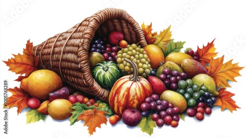 cornucopia, autumn, fruit, grape, harvest, fall, basket, leaf, red, yellow, green, purple, orange, brown, white, background, illustration, painting, food, abundance, thanksgiving, nature, still life, composition, vibrant, colourful, delicious, fresh, ripe, juicy, sweet, seasonal, traditional, festive, celebration