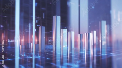 A corporate-style D bar chart with silver and blue bars, set on a reflective surface with floating data labels and a digital grid background.
