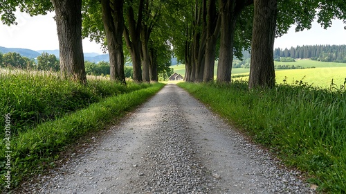 pathway, tree, green, gravel, nature, landscape, rural, serene, tranquil, outdoors, countryside, avenue, sunlight, road, journey, wood, summer, scenery, environment, foliage, health, vegetation, scenic, growth, travel, earth, hill, view, beauty, morning, relaxation, exploration, fresh, departure, field, ground, peace, residential, dirt, shadow, escape