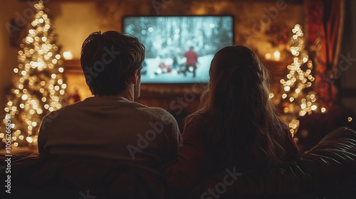 A couple is sitting on a couch watching tv at home in a cozy, Christmas living room in evening