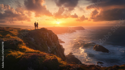 A couple standing on a windswept cliff overlooking an ocean sunset, their forms outlined by golden hour light. Dramatic clouds and rolling waves highlight the dynamic energy of the scene. The atmosphe
