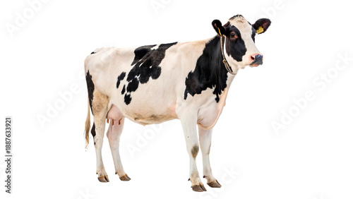 A cow stands still with a white and black pattern on its body isolated on transparent background