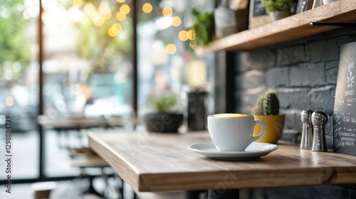 A cozy cafe scene featuring a white cup on a wooden table, surrounded by plants and warm lighting, creating a welcoming ambiance.