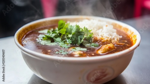 A cozy image of a steaming bowl of chicken curry with a side of fluffy basmati rice, garnished with fresh cilantro, capturing the essence of comfort food