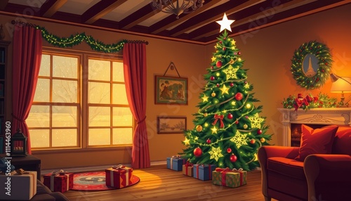 christmas, tree, decoration, gift, cosy, living room, fireplace, window, snow, warm, light, star, chaplet, rug, curtain, furniture, ambience, holiday, celebration, joy, family, tradition, winter, atmosphere, interior, scene, comfort, cheer, evening, glow, design, home, seasonal, red, green, gold, ornament, present, gathering, warmth, nostalgia, happiness, spirit, festivity, calmness
