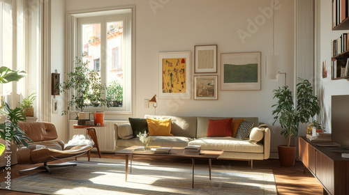 A cozy living room featuring stylish sofa, armchair, and decorative plants. space is brightened by natural light streaming through large windows, creating warm and inviting atmosphere