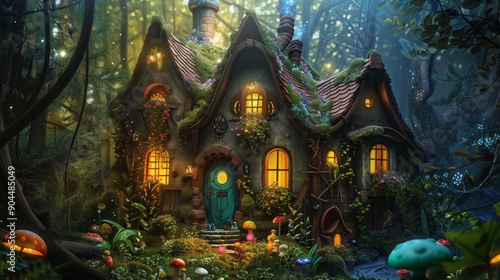 A cozy rustic cottage in a dense forest, surrounded by glowing mushrooms and twinkling lights, evoking a fairytale atmosphere filled with wonder and enchantment.