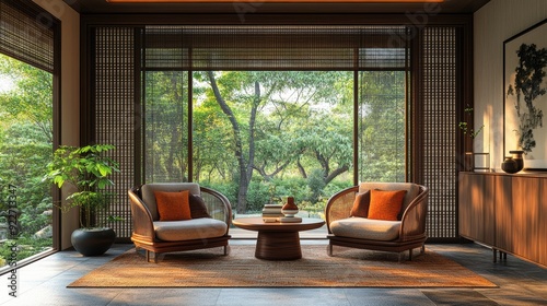 A cozy, serene living room with large windows overlooking a lush garden, featuring a minimalist, natural wooden design with two chairs and a round table.