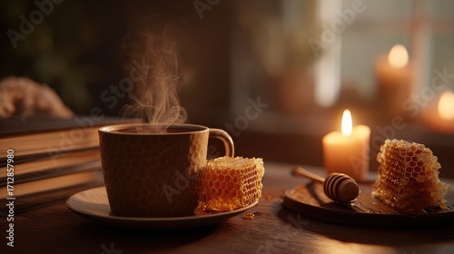 a cozy still life with steaming coffee honeycomb and candle creating a relaxing atmosphere providing a warm and inviting ambiance for a peaceful moment