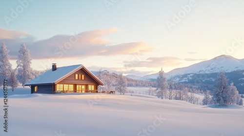 A cozy wooden cabin nestled in a snowy landscape, surrounded by pristine white snow and majestic mountains under a pastel-colored winter sky.